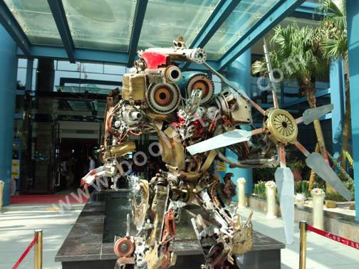 變形金剛“眩暈”,狂派角色,身高2米多,手部拿著一把直升機(jī)旋轉(zhuǎn)葉片,非常霸氣。為變形金剛配上距離感應(yīng)裝置,當(dāng)有人靠近變形金剛的時(shí)候,便會(huì)自動(dòng)發(fā)出語音提醒,許多游客都紛紛停下腳步合影留念。