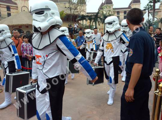 隨后通過大屏幕,“外星人BOSS”向地球人展示了他們的精良科技,并向地球人宣戰!緊接著一群身穿盔甲的“外星戰士”從某個角落突然出現,他們都拿著一個神秘的箱子,踏著莊嚴的腳步從人類中間前進!